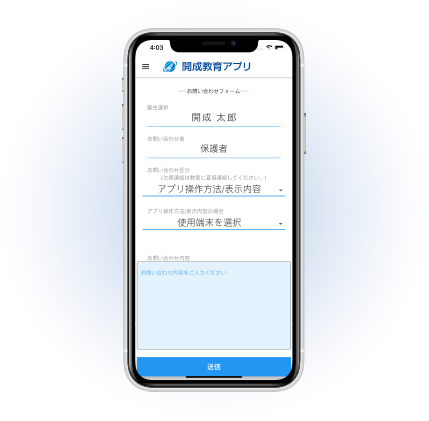「お問い合わせ」画面を通じて、アプリの操作方法や学費の確認などの質問や、授業やイベントへの疑問など、お気軽にお問合せいただくことができます。